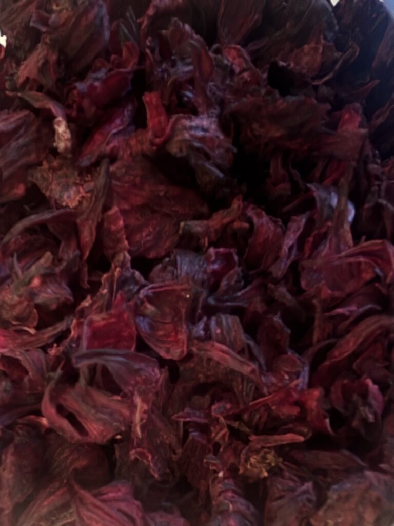 9月に入るとローゼルを収穫し始めます。その頃のガクの部分は柔らかくジャムに最適です。また、晩秋になり少し肌寒くなる頃にはアントシアニンが詰まってドライにすると鮮やかな紅色になります。なので、ベジタリ菜のドライローゼルは注文をいただいてから乾燥加工します。晩秋に収穫後、冷凍してあったローゼルを、40度で24時間乾燥します。酸化を避ける為、作り置きはしないのです。